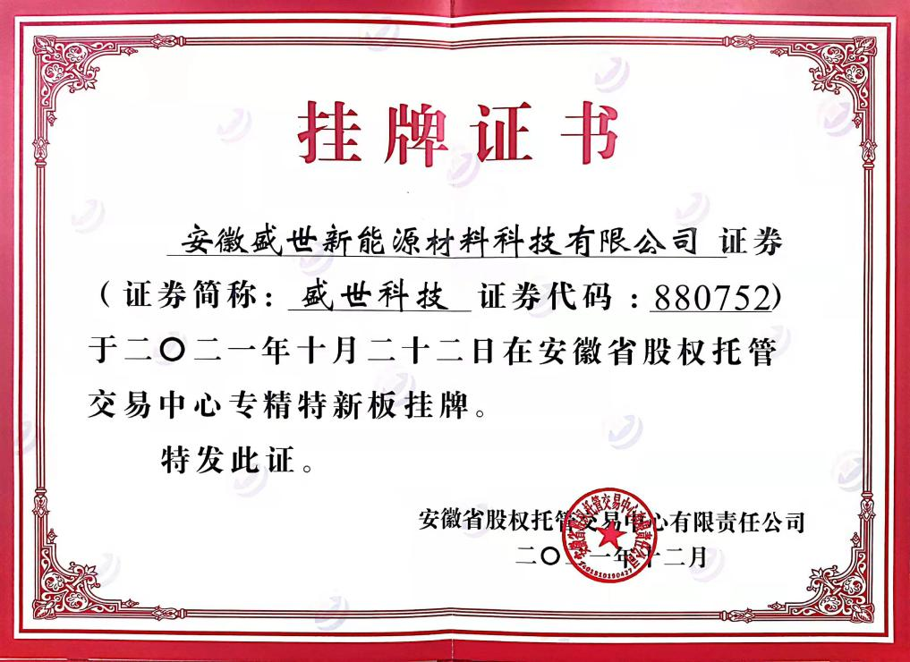 12月14日上午,安徽省第五批“專精特新板”企業(yè)掛牌儀式在合肥隆重舉行,來(lái)自全省的100家“專精特新”企業(yè)成功登陸省股權(quán)托管交易中心“專精特新板”。安徽盛世新能源材料科技有限公司在省“專精特新板”成功掛牌(證券代碼:880752)!